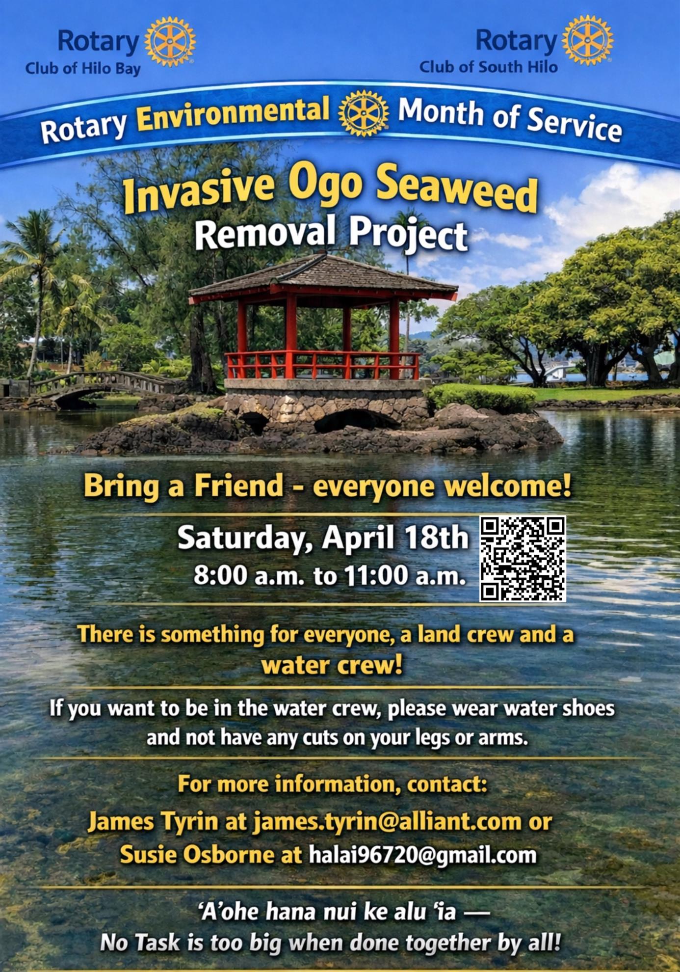 Opening Activities, August 14 2024President Steven convened the meeting right at 7 am. After the Pledge of Allegiance, Alan Okinaka delivered the inspiration. He announced that the planning for Oktober Fest was progressing smoothly and restatede the request for Rotarians to donate $100 in prizes and or gifts for the silent auction. Sharon Scheele announced that there were only three tickets for Junior Achievement Hall of Fame banquent at $120 each. Please contact Sharon to reserve the remaing seats and to arrange for payment. Tim Hansen announced that there would be a work day at the Queen Liliuokalani Gardens on Saturday, August 24th starting at 8 am and ending at noon to rebuild some of the stone walls thin bamboo and other activities. Tim pointed out that the Gardens received a grant from Hilo Bay Rotary a few months ago. He then circulated a sign up sheet.